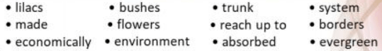 Ornamental shrubs include (5) ____ and hydrangea. Cofee and and tea are (6) ____ important shrubs. Hedges, used for centuries as green (7) ____ around yards and fields, are shrubs too.