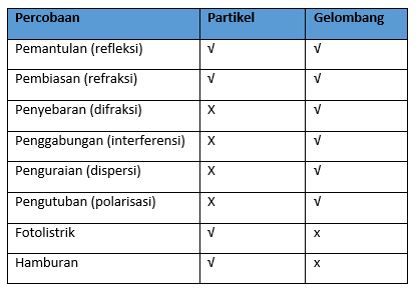 Sifat – sifat yang dapat dipenuhi oleh partikel tetapi tidak dapat dipenuhi oleh gelombang, yaitu ….