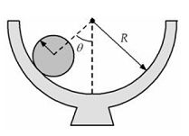 Di atas bidang berbentuk setengah lingkaran dengan permukaan kasar yang memiliki radius 1 m diletakkan bola pejal dengan radius 10 cm bermassa 1 kg seperti pada gambar. Jika sudut = 600, kecepatan sudut di titik terendah adalah …. (g = 9,8 m/s2)