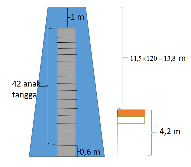 Siswa kelas V melakukan kegiatan menggambar di luar kelas. Amin menggambar menara bertangga dengan skala 1 : 120. Di samping menara terdapat tiang bendera. Tinggi sebenarnya tiang bendera . Jarak anak tangga pertama dengan permukaan tanah , dan jarak anak tangga teratas dengan puncak menara . Banyak anak tangga ada 42. Jarak antar anak tangga sama. Selisih tinggi tiang bendera dengan puncak menara dalam gambar . Jarak sebenarnya anak tangga ke 13 dengan permukaan tanah adalah ...