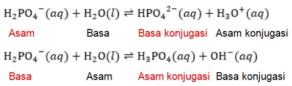 Menurut teori asam-basa Brønsted-Lowry, ion dihidrogen fosfat yang bereaksi dengan air akan menghasilkan ion hidrogen fosfat sebagai asam konjugasi atau asam fosfat sebagai basa konjugasi.