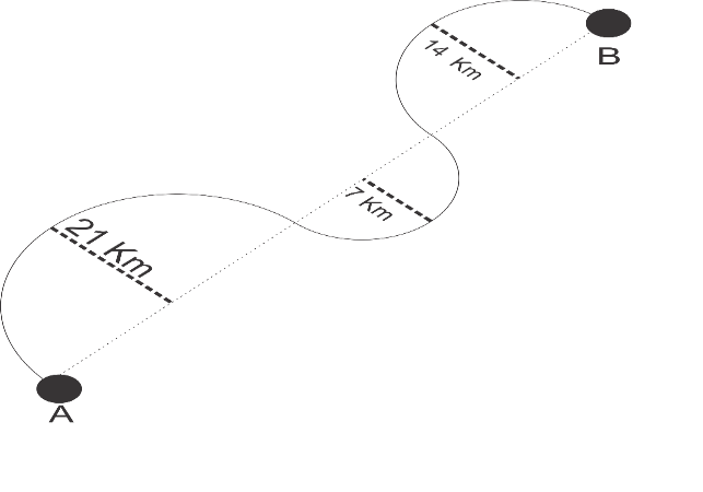 Soni pergi ke kota B dari kota A menggunakan sebuah sepeda motor, dengan lintasan berliku seperti pada gambar. Apabila speedometer yang dipasang pada motor Soni selalu menunjukkan angka 40 km/jam maka waktu yang ditempuh Soni untuk sampai ke kota B, serta kecepatan sepeda motornya adalah ....