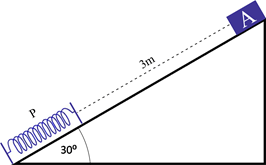 Benda A yang memiliki massa 0,5 kg dan mula-mula diam meluncur 3 m pada papan licin yang membentuk sudut 30° dengan bidang datar. Kemudian benda A menumbuk pegas P yang salah satu ujungnya tertancap kuat pada ujung papan. Jika konstanta pegas , maka pemendekan maksimum pegas adalah....