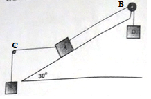 Pada gambar berat benda A dan E masing-masing 100 N dan 10 N. Apabila tali AC horizontal dan tali AB sejajar bidang serta bidang miring dan katrol licin, maka sistem setimbang untuk berat D sebesar ….
