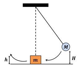 Suatu ayunan yang massa bandulnya M dinaikkan pada ketinggian H kemudian dilepaskan. Pada bagian terendah lintasannya, bandul membentur suatu balok bermassa m yang mula-mula diam di atas permukaan mendatar yang licin. Apabila setelah benturan bandul dan balok saling menempel, ketinggian h yang dapat dicapai keduanya adalah ....