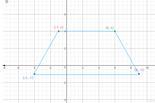 Suatu bangun ABCD dengan titik koordinat A (-1,4), B (-4, -1) dan C (6, 4). Koordinat titik D yang membuat bangun tersebut menjadi trapesium sama kaki adalah....