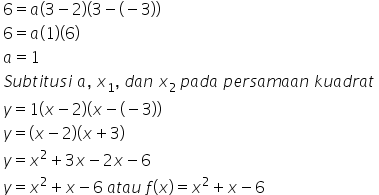 Suatu fungsi kuadrat melalui titik (3, 6) dan memotong sumbu x di titik A (2, 0) dan B (-3, 0). Maka persamaan fungsi kuadrat tersebut adalah ....