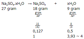 Suatu garam natrium sulfat hidrat sebanyak 27 gram dipanaskan menghasilkan 18 gram natrium sulfat anhidrat. Berapakah jumlah molekul air yang terikat pada garam natrium sulfat hidrat jika diketahui Mr Na2SO4 = 142 gram/mol dan Mr H2O = 18 gram/mol?