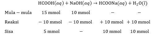 Suatu larutan dibuat dengan mencampurkan 150 mL larutan asam format (HCOOH) 0,1 M dan 100 mL larutan natrium hidroksida (NaOH) 0,1 M. Setelah pencampuran tersebut pH larutan adalah ....
