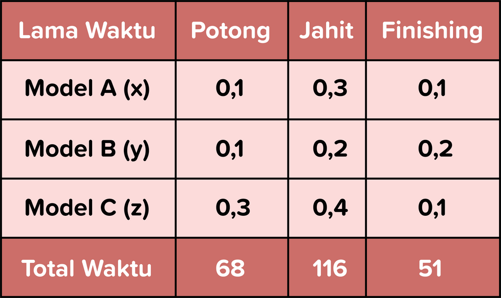 Suatu Perusahaan Konveksi Memproduksi tiga model pakaian. Lama waktu pemotongan, penjahitan, dan finishing setiap potong disajikan dalam tabel berikut.