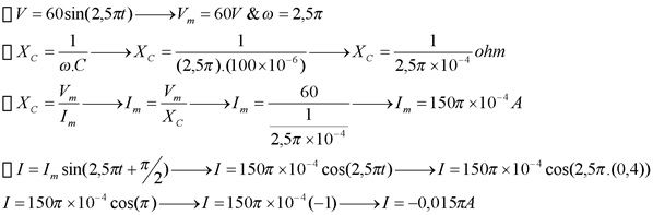 Suatu rangkaian kapasitif murni diberikan tegangan bolak–balik yang sesuai dengan fungsi: , dengan t dalam sekon. Jika kapasitansi kapasitor adalah 100 μF, maka arus yang mengalir ketika t = 0,4 s adalah ...