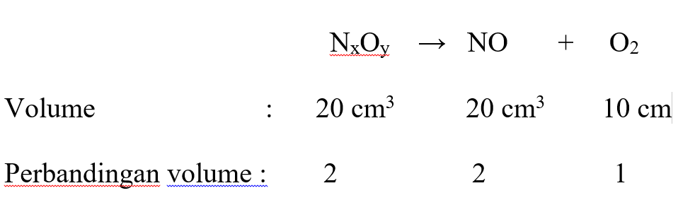 Suatu reaksi diukur pada suhu dan tekanan yang sama. Jika 20 cm3 suatu oksida nitrogen terurai menghasilkan 20 cm3 nitrogen (II) oksida dan 10 cm3 oksigen, maka oksida nitrogen tersebut adalah....