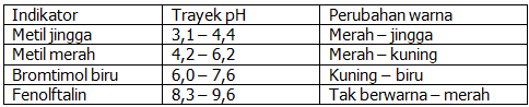 Didapatkan hasil bahwa, dengan indikator metil jingga berwarna jingga, dengan indikator metil merah berwarna kuning, dengan indikator bromtimol biru berwarna biru dan dengan indikator fenolftalin tak berwarna. Maka pH air sungai tersebut sekitar….