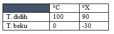 Suatu termomenter X memiliki titik beku air pada suhu -30 °X dan titik didih air pada 90 °X. Jika termometer tersebut menunjukkan nilai 60 °X, maka nilai tersebut setara dengan ....