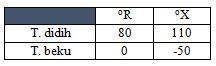Suatu termomenter X memiliki titik beku air pada suhu -50°X dan titik didih air pada 110°X. Termometer tersebut menunjukkan tiga kali nilai termometer reamur pada suhu ....