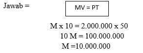 Suatu transaksi ekonomi pada tingkat harga sebesar Rp. 2.000.000,00 barang yang terjual sebanyak 50 unit, kecepatan peredaran uang pada saat itu sebesar 10 kali, berapakah besarnya uang yang beredar dalam transaksi tersebut ?