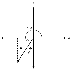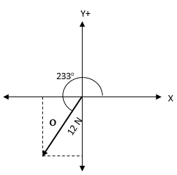 Suatu vektor O memiliki besar 12 N serta membentuk sudut 233o terhadap sumbu x+ seperti yang terlihat pada gambar berikut.