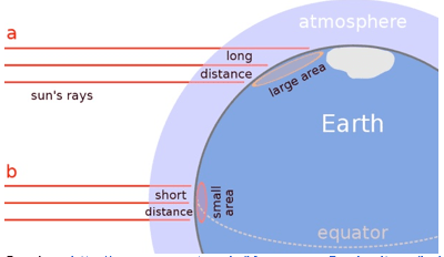 Suhu udara di wilayah lintang rendah cenderung lebih tinggi. Hal ini disebabkan oleh ….