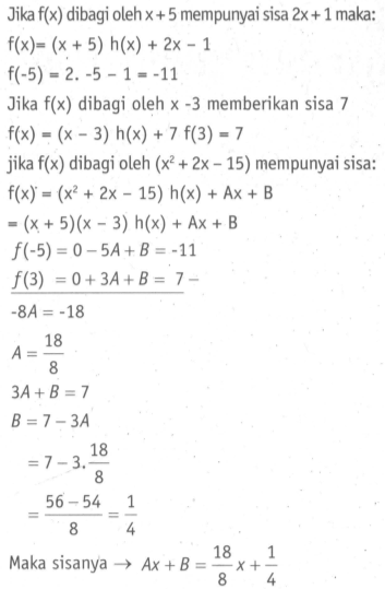 Suku banyak f(x) dibagi (x + 5) memberikan sisa (2x - 1), dan dibagi oleh (x - 3) memberikan sisa 7. Sisa pembagian f(x) oleh adalah....