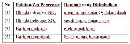 Tabel berikut ini berisi polutan/zat pencemar di udara dan dampak yang ditimbulkannya.
