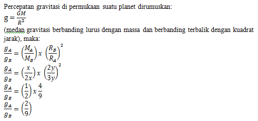 Jika gA dan gB masing-masing adalah percepatan gravitasi di permukaan planet A dan B maka gA ∶ gB adalah .…