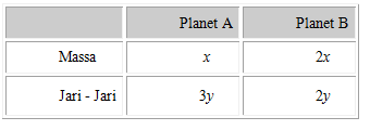 Tabel berikut ini merupakan data dari dua planet A dan B.