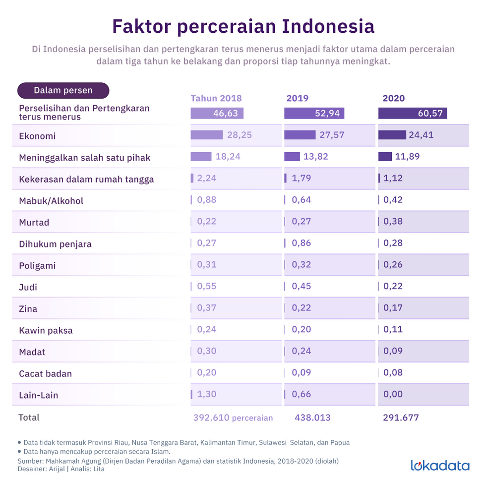 Maharrani, Anindhita. 2021. "Faktor Penceraian Indonesia. Locadata.id. Diunduh pada 30 September 2021. https://lokadata.id/artikel/ini-sejumlah-alasan-pasangan-indonesia-bercerai
