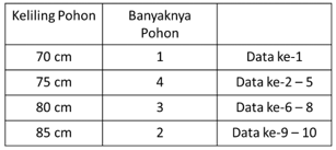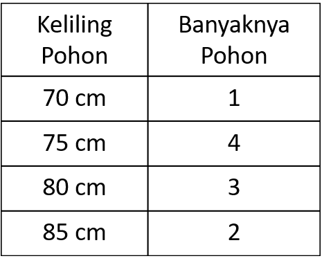 Tabel berikut menyajikan tentang keliling lingkaran batang Pohon Jati di suatu kebun Jati