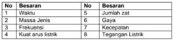 Tabel di atas merupakan contoh besaran pokok dan besaran turunan, yang merupakan besaran pokok ditunjukkan oleh nomor...
