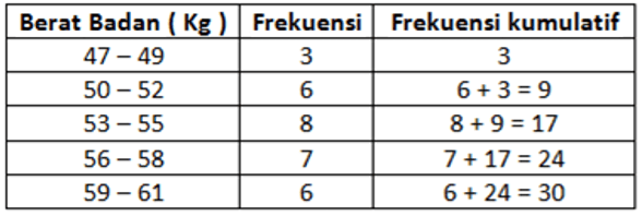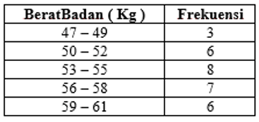 Tabel distribusi frekuensi berikut ini adalah hasil pengukuran berat badan 30 siswa (Kg):