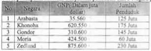 Tabel pendapatan nasional dan jumlah penduduk dari 5 Negara pada tahun 2011: