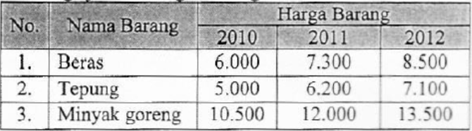 Tabel tiga jenis barang dan harga selama 3 tahun :