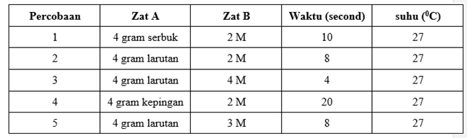 Berdasarkan data tersebut, percobaan yang dipengaruhi variabel bebas luas permukaan dan konsentrasi adalah percobaan….