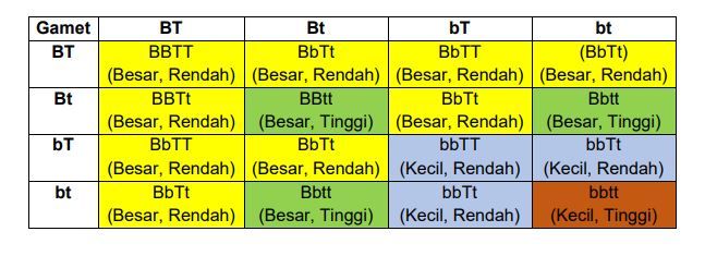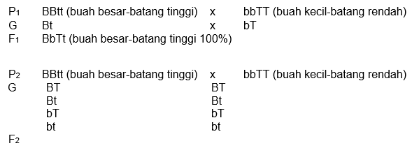 Tanaman mangga berbuah besar berbatang tinggi (BBtt) disilangkan dengan tanaman mangga berbuah kecil berbatang rendah (bbTT). Bagaimanakah fenotif keturunan F2 nya ....