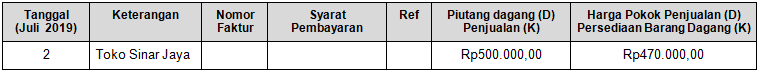 Tanggal 2 Juli 2019 Toko Sinar Jaya menjual barang dagang kepada Pak Sobarna dengan syarat 3/10, n/40 sebesar Rp500.000,00. Adapun nilai harga pokok penjualannya adalah sebesar Rp470.000,00. Pencatatan Toko Sinar Jaya pada transaksi tersebut jika menggunakan metode perpetual adalah ….