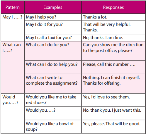 Look back at the dialogs in part D. Pay attention to the italicized expressions and the last two questions following the dialogs. Write down the pattern of expressions to offer help/service and its responses. See the example.