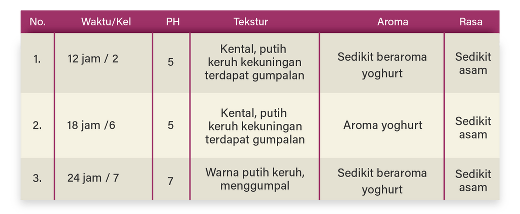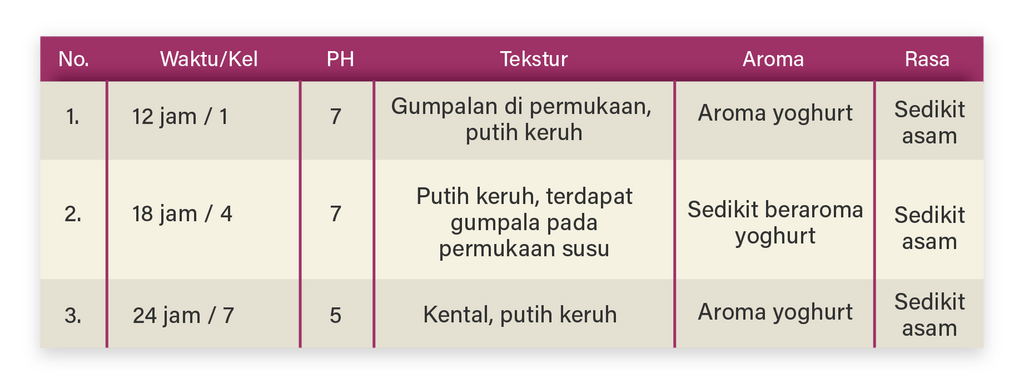 Perbedaan yang sedikit menonjol hanya pada pH dan rasa pada uji coba susu murni dari semua waktu yg ditentukan. Untuk susu murni, seluruhnya memiliki pH 7 dan rasanya tawar, sedangkan untuk susu full cream dan susu nonfat memiliki perbedaan pH tergantung pada waktu yg ditentukan. Untuk susu full cream, waktunya 12 jam dan 18 jam pH nya 7 sedangkan untuk yang waktunya 24 jam PH nya 5. Untuk rasa yg dihasilkan seluruhnya sedikit asam. Sementara itu, untuk susu nonfat pada waktu 12 jam dan 18 jam pH-nya 5 sedangkan untuk waktu 24 jam pH-nya 7. Untuk rasa, semuanya sama yaitu sedikit asam. Untuk tekstur dan aroma, semuanya memiliki persamaan dari semua jenis percobaan susu dan waktu, yaitu warnanya putih keruh dan terdapat gumpalan-gumpalan pada permukaan susu dan aromanya. Untuk full cream dan nonfat, yaitu sedikit beraroma yoghurt, sedangkan susu muri memiliki aroma yoghurt.