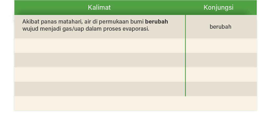 Temukan kata kerja material yang menunjukkan perbuatan fisik atau peristiwa dalam teks “Siklus Hidrologi”, kemudian isikan ke kolom berikut.