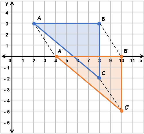 A(2,3)⇒A′(x′,y′)=(2,−3)+(2,3)=(2+2,−3+3)=(4,0)B(8,3)⇒B′(x′,y′)=(2,−3)+(8,3)=(2+8,−3+3)=(10,0)C(8,−2)⇒C′(x′,y′)=(2,−3)+(8,−2)=(2+8,−3−2)=(10.−5)