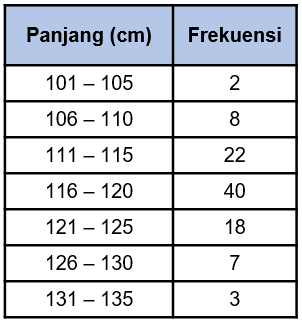 Kelas data 101 - 105 memuat data 101, 102, 103, 104, dan 105 maka panjang kelasnya ada 5. atau menggunakan rumus