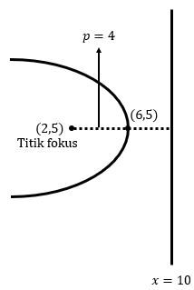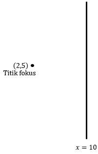 Tentukan persamaan dari parabola dengan fokus (2, 5) dan garis direktriks x = 10 adalah ....