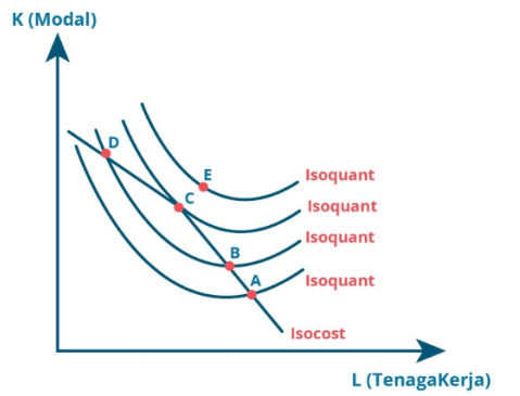 Titik E menunjukkan biaya yang dimiliki produsen tidak mencukupi kebutuhan faktor produksi.