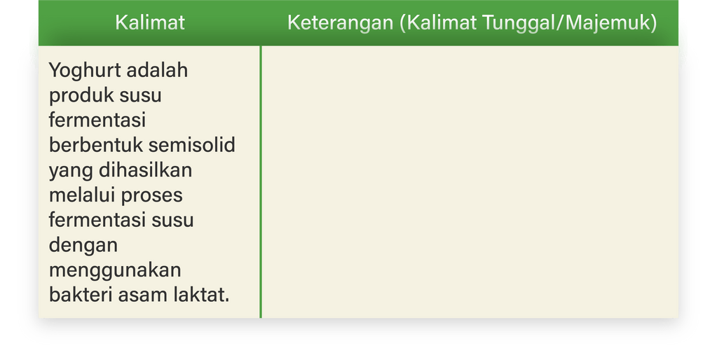 Dengan demikian, kalimat Yoghurt adalah produk susu fermentasi berbentuk semisolid yang dihasilkan melalui proses fermentasi susu dengan menggunakan bakteri asam laktat merupakan kalimat majemuk karena terdiri atas tiga kalimat tunggal.