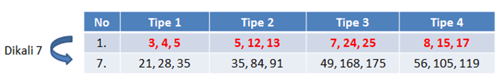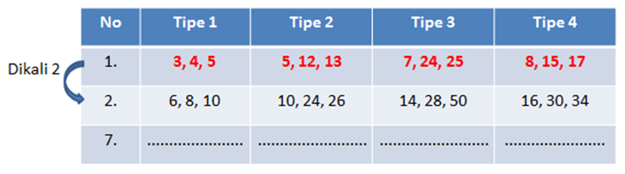 Terdapat 4 tipe bilangan yang termasuk tripel Phytagoras. Susunan 4 tipe bilangan tripel Phytagoras dapat dilihat pada tabel berikut ini.