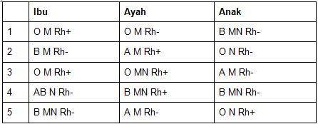 Terdapat beberapa gen pada manusia selain gen ABO yang mengatur antigen yang dapat dikenali di permukaan sel darah merah, contohnya gen MN dan Rh. Gen Rh dapat berupa alel positif atau negatif, dengan alel positif dominan terhadap alel negatif. M dan N adalah alel kodominan dalam gen MN. Berikut adalah tabel yang menunjukkan golongan darah orang tua dan anaknya.