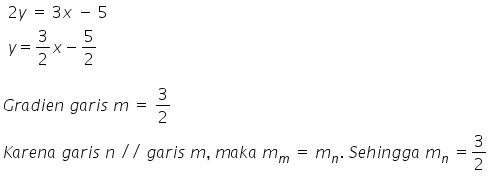 Terdapat garis m dengan persamaan 2y = 3x -5. Jika garis n sejajar garis m, gradien garis n adalah ....