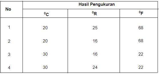 Termometer X memiliki titik beku 25°X dan titik didih 175°X. Jika termometer X menunjukkan angka 55°X. maka hasil pengukuran yang diperoleh seperti pada tabel berikut ini.