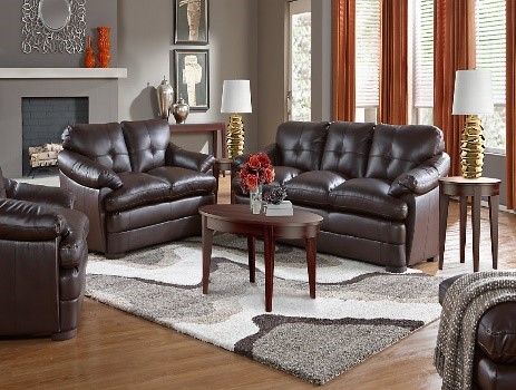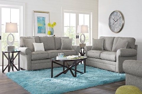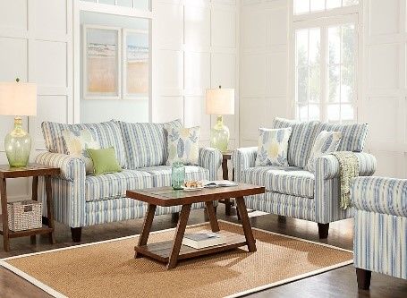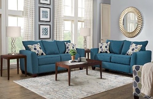 The living room is pretty with grey wall and wooden floor. There are a mirror and three pictures on the wall. There are two blue couches in the room with four cushions on them.