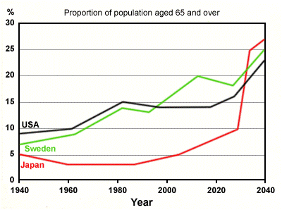 In 1980, the proportion of population aged 65 and over in Japan is lower than in USA and Sweden