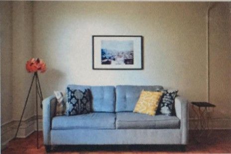 The picture is hung ____ the wall ____ the sofa.